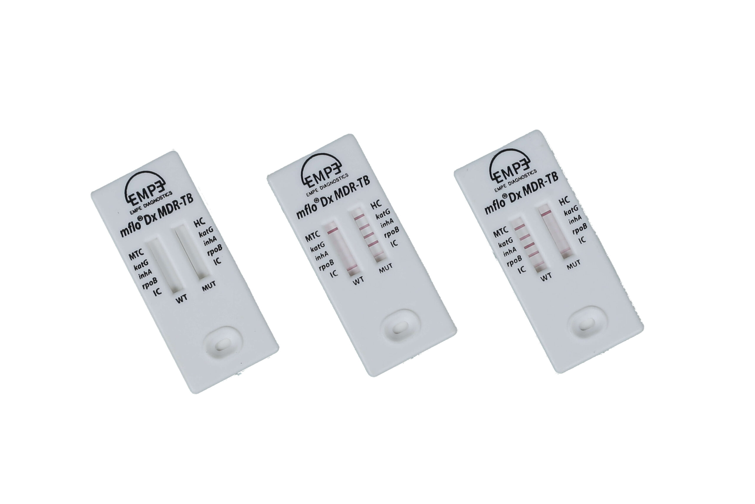 EMPE Diagnostics has developed mfloDx™ technology (patents granted), a diagnostic platform combining the padlock probe-dependent rolling circle amplification (RCA) and ultrasensitive lateral flow biosensors. This integrated approach allows for the rapid, accurate, and cost-effective detection of Mycobacterium tuberculosis complex (MTBC) and its resistance to key antibiotics rifampicin (RIF) and isoniazid (INH) directly from sputum samples within three hours. The detection signal is processed and visualized using a lateral flow cassette, like a home pregnancy or COVID-19 test, in which the “wild type” (WT) and “mutant” (MUT) windows on the cassette indicate the presence of the bacterium and its specific drug resistance profile. This technology enables clinicians to get a qualitative “Yes” or “No” result for both TB presence and drug resistance, facilitating the prompt initiation of correct treatment, especially in resource-limited settings. The mfloDx™ MDR-TB kit (CDSCO approved) is currently available for purchase.